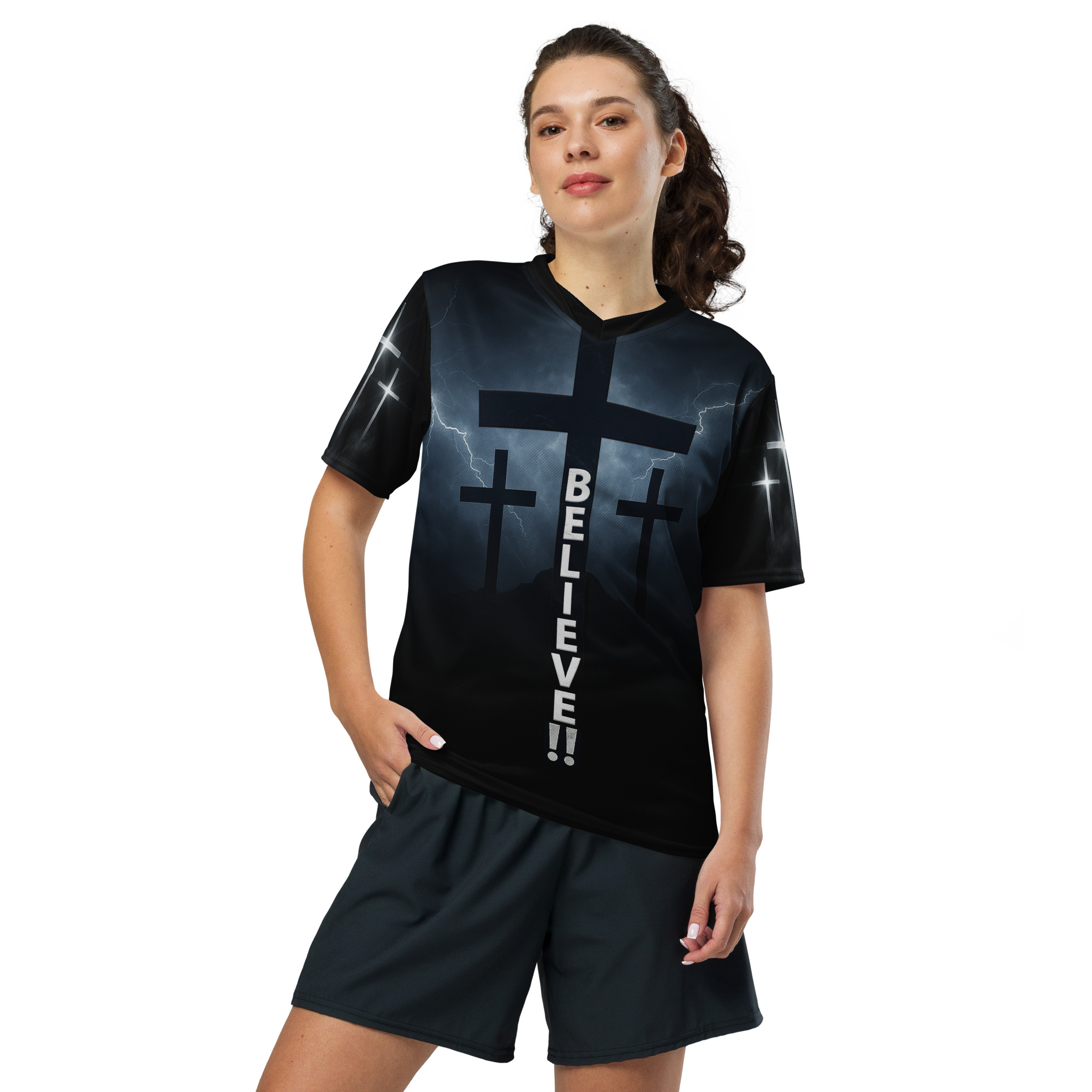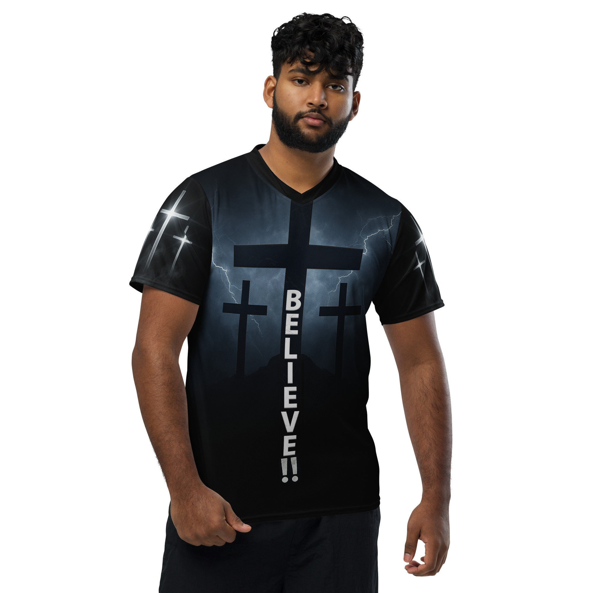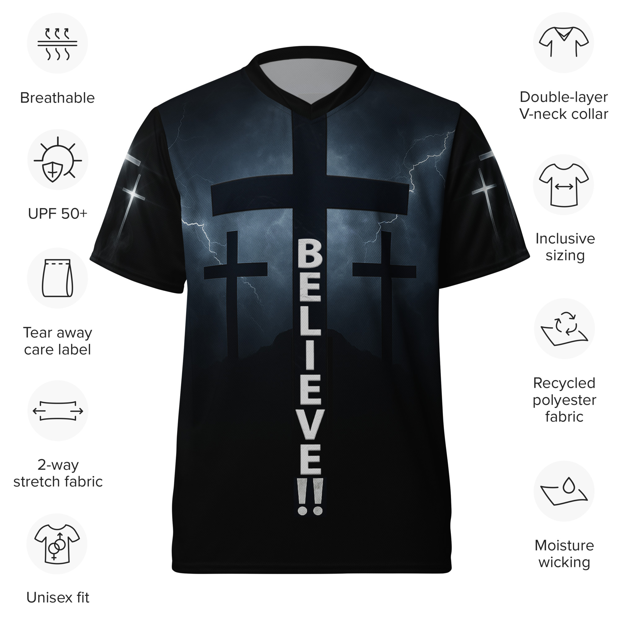 Looking for the perfect sports jersey? We have you covered—made of 100% recycled polyester fabric, this shirt is breathable, moisture-wicking, and has a double-layered v-neck collar that creates a premium look.