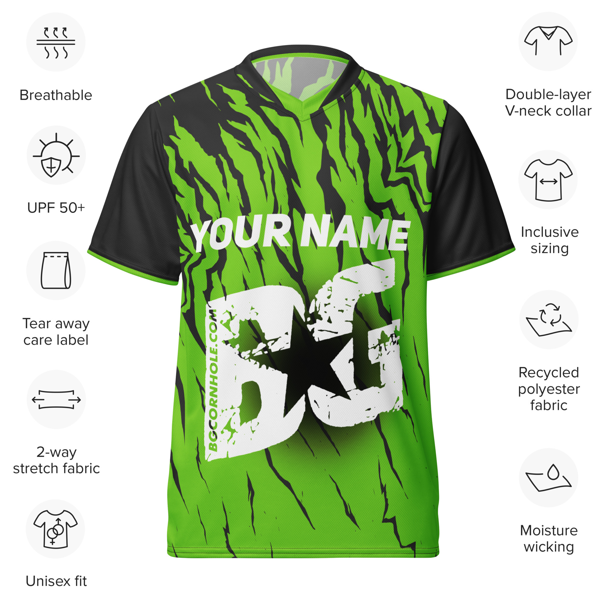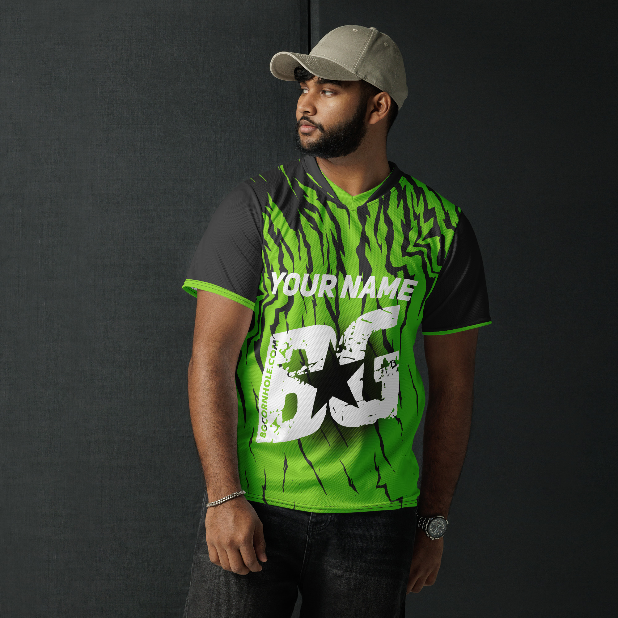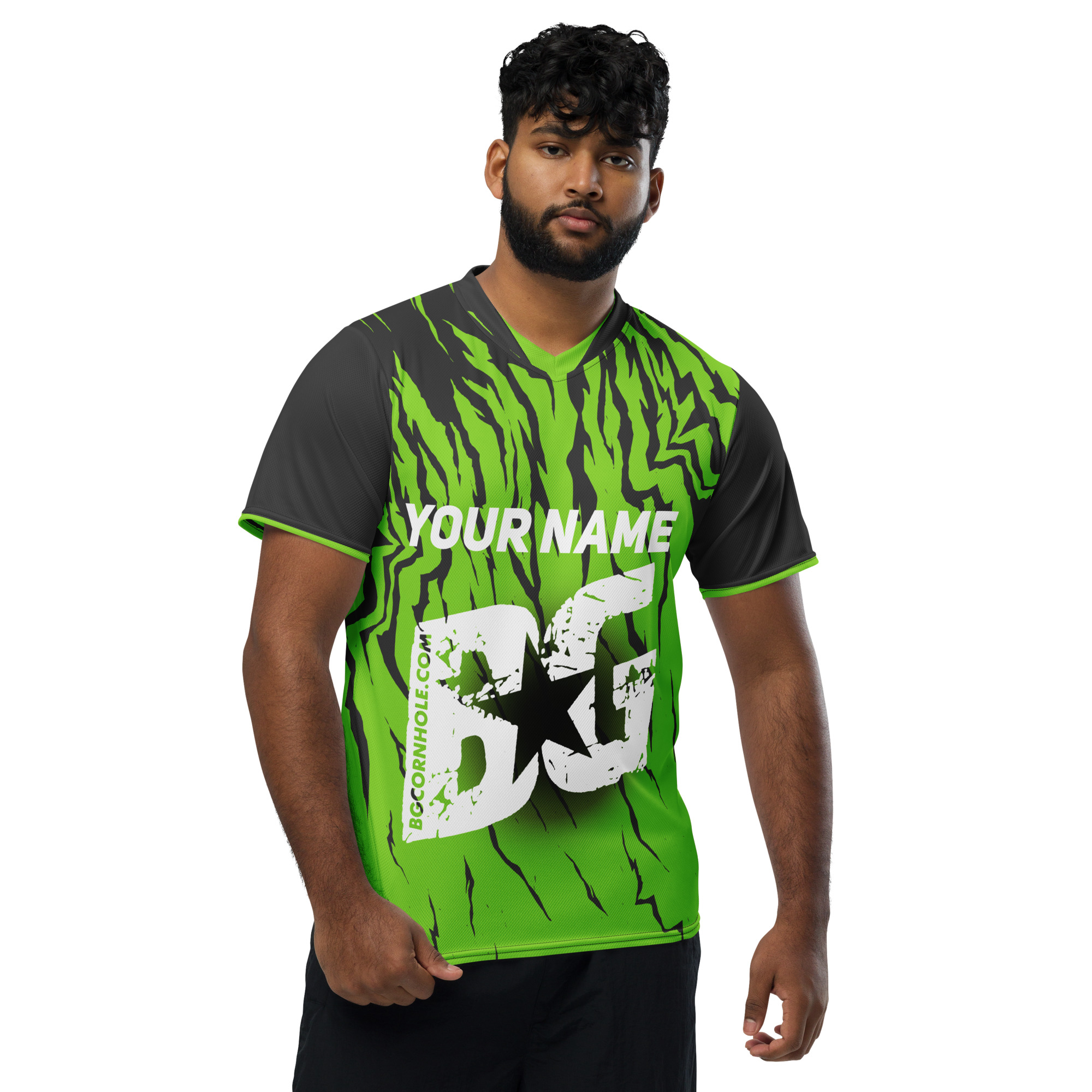 Looking for the perfect sports jersey? We have you covered—made of 100% recycled polyester fabric, this shirt is breathable, moisture-wicking, and has a double-layered V-neck collar that creates a premium look.